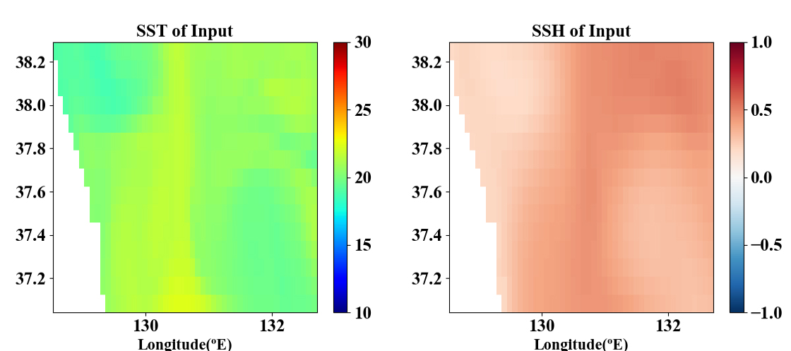 그림 2 OSTIA SST(좌), CMEMS SSH(우) - 해양글라이더와 인공위성 자료는 현재 날짜를 중심으로 과거 30일치의 자료가 AI 모델에 입력되며, 이를 통해 30일치의 4차원 구조를 재현합니다.