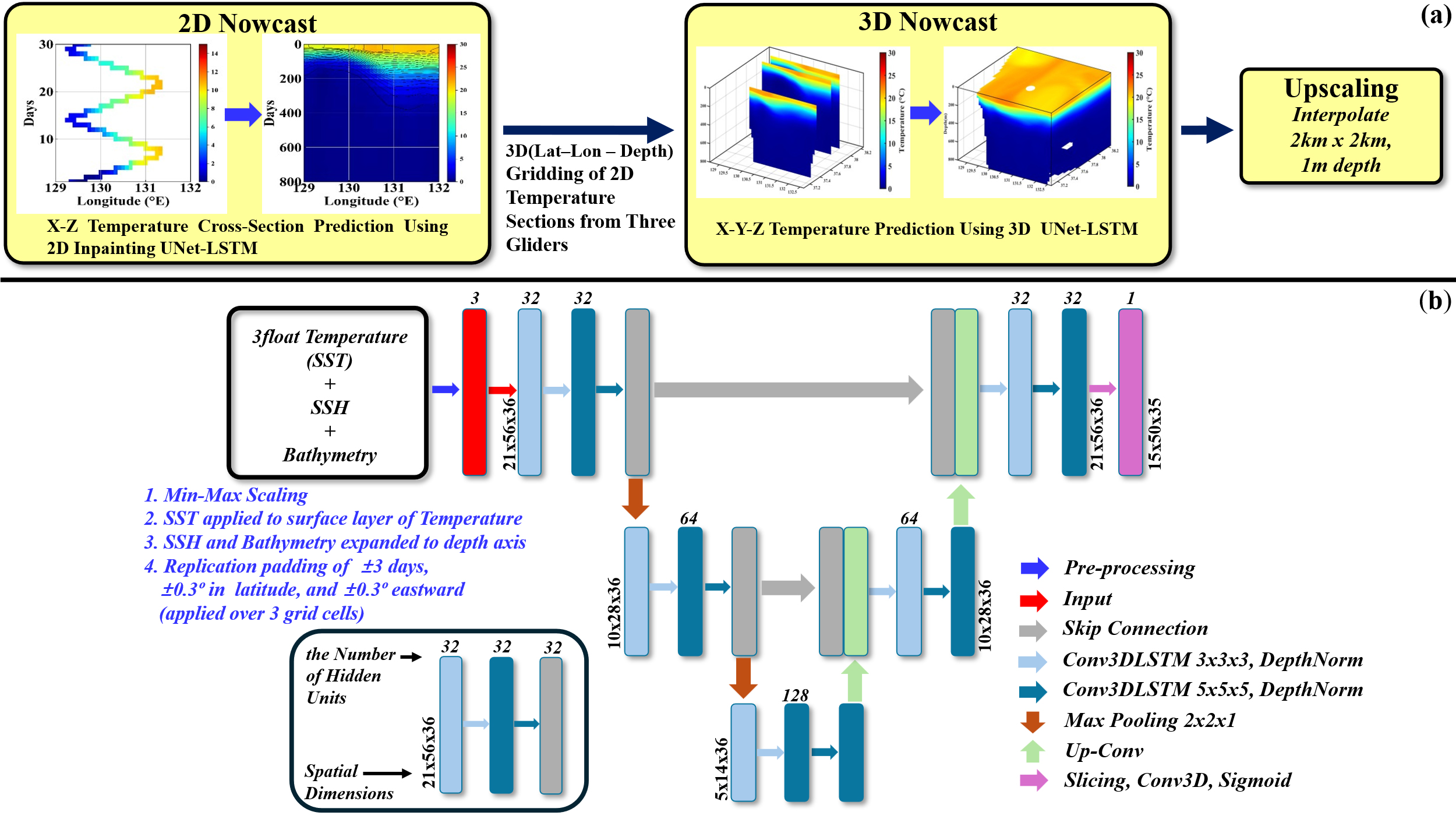 3D UNet-LSTM 기반 해양 수온 Nowcast의 흐름도와 구조 – (a)글라이더 자료로부터 AI 2D Inpainting UNet-LSTM으로 수온 단면을 생성하고, 이를 3차원 격자로 변환해 AI 3D UNet-LSTM으로 예측, (b)Conv3D-LSTM 블록과 스킵 연결, 다중 스케일 공간 특성을 결합한 3D UNet-LSTM 모델 구조
